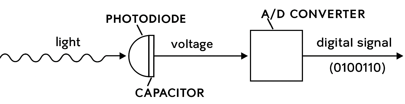 Light (electromagnetic radiation) is collected by a photodiode and converted into electrical charge or voltage, which is then processed by an analog-to-digital converter to turn it into a binary signal (a series of ones and zeros).