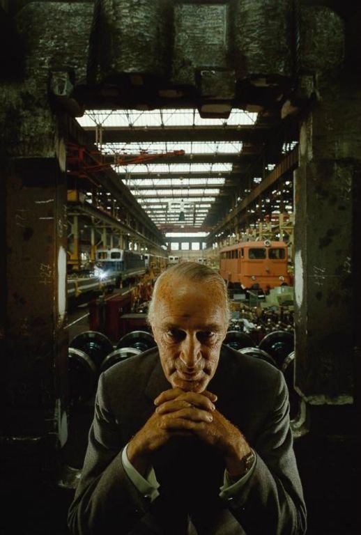 Vamos al lío: estamos ante el retrato de un hombre de unos 60 años, blanco, vestido de traje en el interior de una nave industrial.